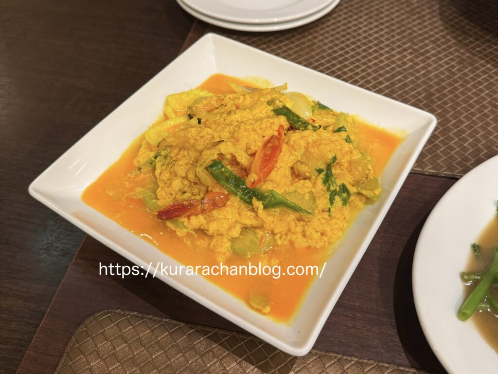 カレー味の卵と野菜と海老蟹の炒め物…みたいな?