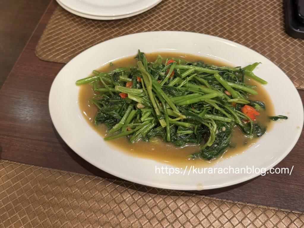 空心菜がシャキシャキ、ニンニクが効いてて地味だけどめちゃくちゃ美味しかった!